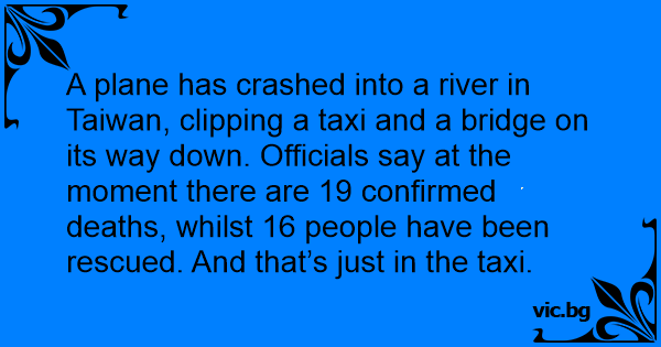 A plane has crashed into a river in Taiwan, clipping a taxi and a bridge on its way down. Officials say at the moment there are 19 confirmed deaths, whilst 16 people have been rescued. And that’s just in the taxi.