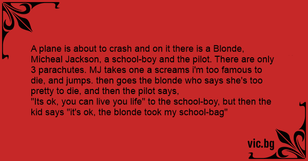 A plane is about to crash and on it there is a Blonde, Micheal Jackson, a school-boy and the pilot. There are only 3 parachutes. MJ takes one a screams i'm too famous to die, and jumps. then goes the blonde who says she's too pretty to die, and then the pilot says,