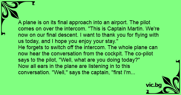He forgets to switch off the intercom. The whole plane can now hear the conversation from the cockpit. The co-pilot says to the pilot, "Well, what are you doing today?"