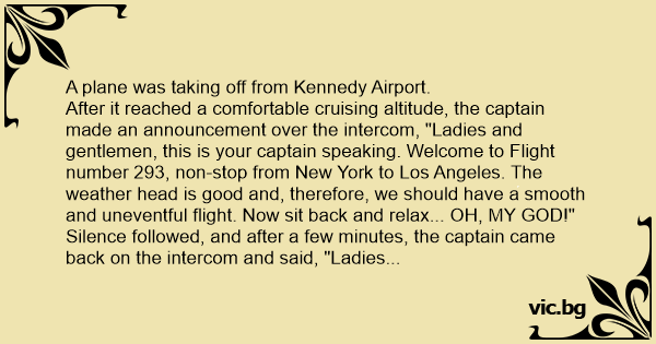 After it reached a comfortable cruising altitude, the captain made an announcement over the intercom, "Ladies and gentlemen, this is your captain speaking. Welcome to Flight number 293, non-stop from New York to Los Angeles. The weather head is good and, therefore, we should have a smooth and uneventful flight. Now sit back and relax... OH, MY GOD!"