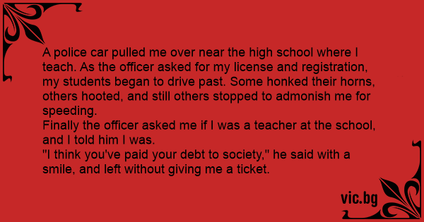A police car pulled me over near the high school where I teach. As the officer asked for my license and registration, my students began to drive past. Some honked their horns, others hooted, and still others stopped to admonish me for speeding.