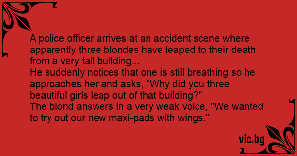 A police officer arrives at an accident scene where apparently three blondes have leaped to their death from a very tall building...