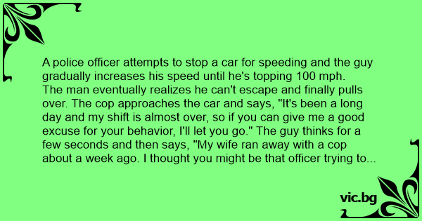 The man eventually realizes he can't escape and finally pulls over. The cop approaches the car and says, "It's been a long day and my shift is almost over, so if you can give me a good excuse for your behavior, I'll let you go." The guy thinks for a few seconds and then says, "My wife ran away with a cop about a week ago. I thought you might be that officer trying to give her back!"