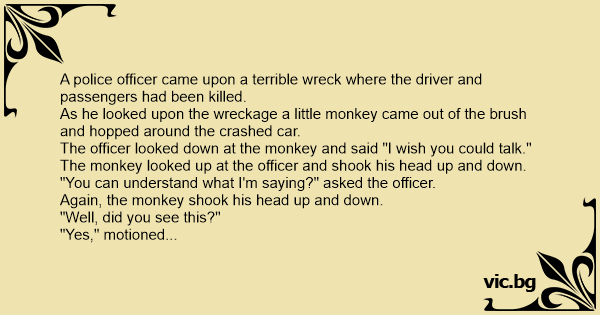 The officer looked down at the monkey and said "I wish you could talk."