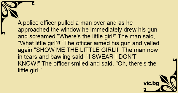 A police officer pulled a man over and as he approached the window he immediately drew his gun and screamed "Where's the little girl!" The man said, "What little girl?!" The officer aimed his gun and yelled again "SHOW ME THE LITTLE GIRL!!" The man now in tears and bawling said, "I SWEAR I DON'T KNOW!" The officer smiled and said, "Oh, there's the little girl."