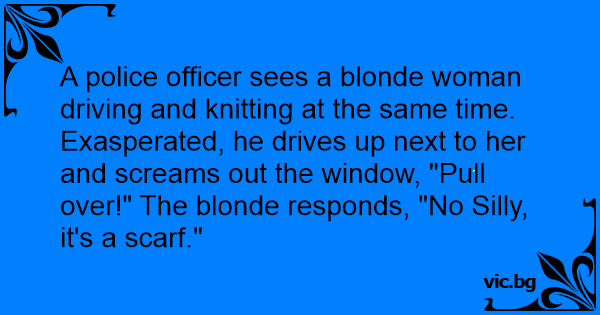 A police officer sees a blonde woman driving and knitting at the same time. Exasperated, he drives up next to her and screams out the window, "Pull over!" The blonde responds, "No Silly, it's a scarf."
