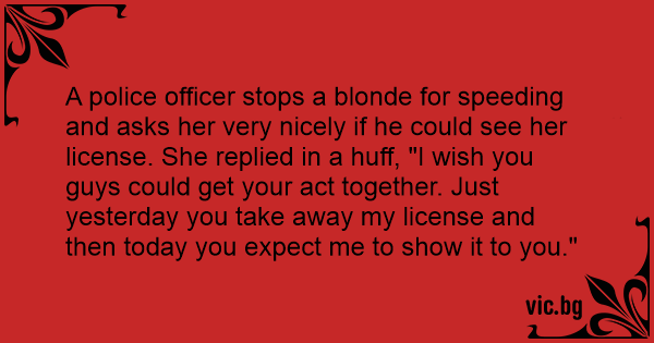 A police officer stops a blonde for speeding and asks her very nicely if he could see her license. She replied in a huff, "I wish you guys could get your act together. Just yesterday you take away my license and then today you expect me to show it to you."