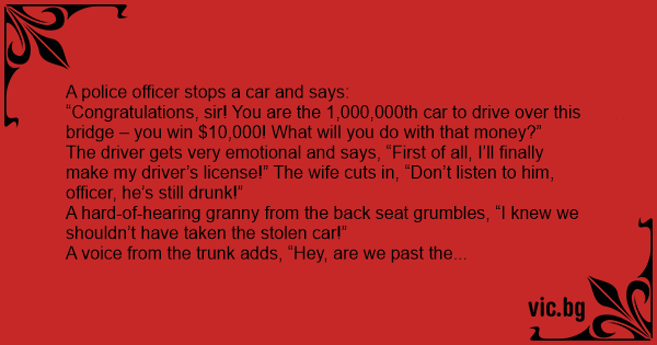 The driver gets very emotional and says, “First of all, I’ll finally make my driver’s license!” The wife cuts in, “Don’t listen to him, officer, he’s still drunк!”