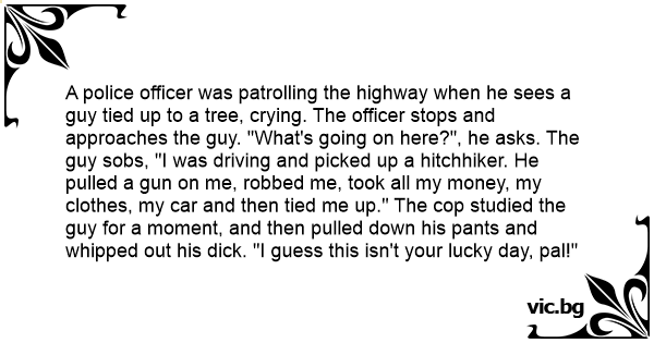 A police officer was patrolling the highway when he sees a guy tied up to a tree, crying. The officer stops and approaches the guy. "What's going on here?", he asks. The guy sobs, "I was driving and picked up a hitchhiker. He pulled a gun on me, robbed me, took all my money, my clothes, my car and then tied me up." The cop studied the guy for a moment, and then pulled down his pants and whipped out his diск. "I guess this isn't your lucky day, pal!"
