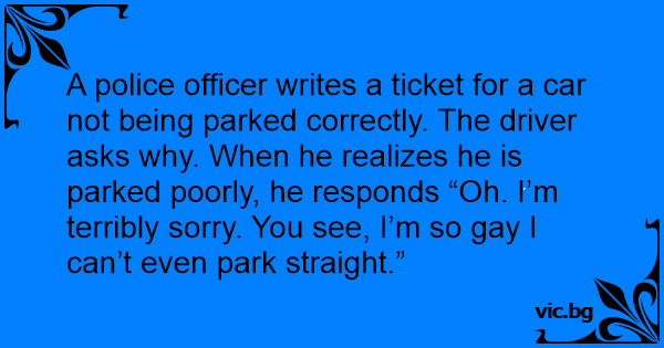 A police officer writes a ticket for a car not being parked correctly. The driver asks why. When he realizes he is parked poorly, he responds “Oh. I’m terribly sorry. You see, I’m so gаy I can’t even park straight.”