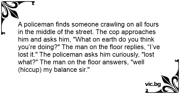 A policeman finds someone crawling on all fours in the middle of the street. The cop approaches him and asks him, "What on earth do you think you’re doing?" The man on the floor replies, “I’ve lost it." The policeman asks him curiously, "lost what?" The man on the floor answers, "well (hiccup) my balance sir."