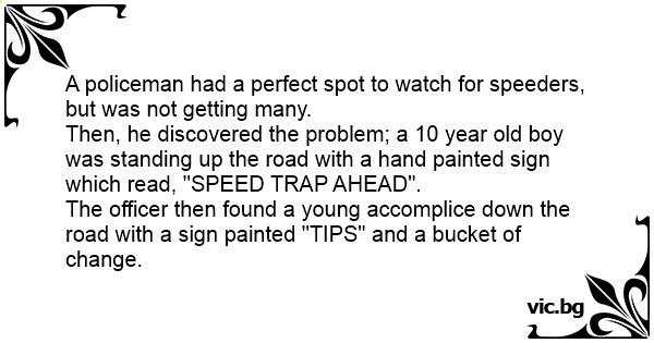 Then, he discovered the problem; a 10 year old boy was standing up the road with a hand painted sign which read, "SPEED TRAP AHEAD".