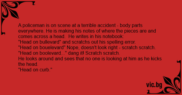 Двајца полицајци разгледуваат сообраќајна несреќа. Првиот прашува: - Каде е ногата? Другиот одговара: - В нива. - А каде е раката? - В нива. - А главата? - На асвалтот. - Се пишува "асвалт" или...
