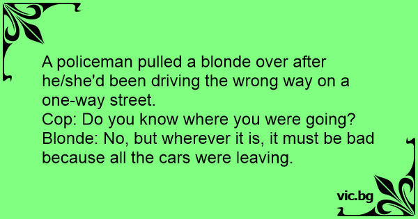 A policeman pulled a blonde over after he/she'd been driving the wrong way on a one-way street.