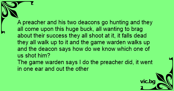 A preacher and his two deacons go hunting and they all come upon this huge buck, all wanting to brag about their success they all shoot at it, it falls dead they all walk up to it and the game warden walks up and the deacon says how do we know which one of us shot him?