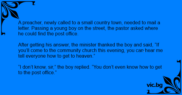 A preacher, newly called to a small country town, needed to mail a letter. Passing a young boy on the street, the pastor asked where he could find the post office.