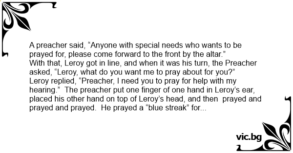 Leroy replied, “Preacher, I need you to pray for help with my hearing.” The preacher put one finger of one hand in Leroy’s ear, placed his other hand on top of Leroy’s head, and then prayed and prayed and prayed. He prayed a “blue streak” for Leroy, and the whole congregation joined in with great enthusiasm. After a few minutes, the preacher removed his hands, stood back and asked, “Leroy, how is your hearing now?”