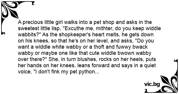 A precious little girl walks into a pet shop and asks in the sweetest little lisp, "Excuthe me, mithter, do you keep widdle wabbits?" As the shopkeeper's heart melts, he gets down on his knees, so that he's on her level, and asks, "Do you want a widdle white wabby or a thoft and fuwwy bwack wabby or maybe one like that cute widdle bwown wabby over there?" She, in turn blushes, rocks on her heels, puts her hands on her knees, leans forward and says in a quiet voice, "I don't fink my pet python weally gives a thit.