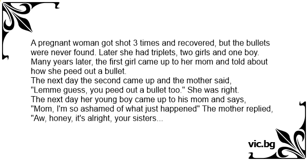 "Mom, I'm so ashamed of what just happened" The mother replied, "Aw, honey, it's alright, your sisters peed out a bullet too, it's nothing to be ashamed of."