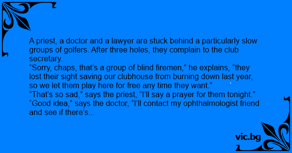 A priest, a doctor and a lawyer are stuck behind a particularly slow groups of golfers. After three holes, they complain to the club secretary.
