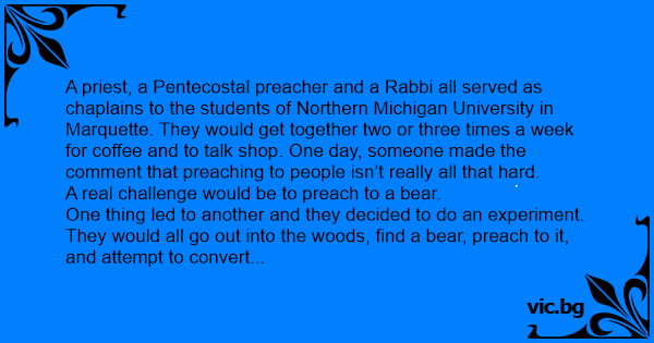One thing led to another and they decided to do an experiment. They would all go out into the woods, find a bear, preach to it, and attempt to convert it.