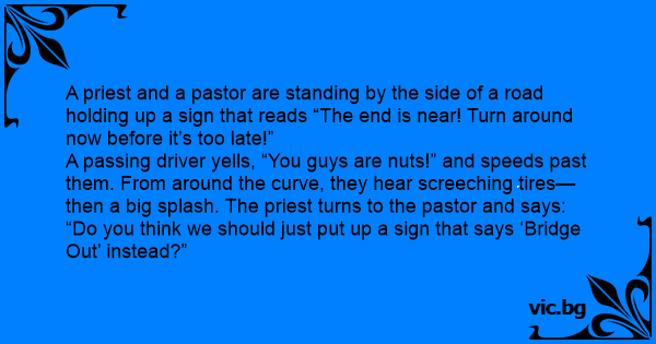 Två präster stod vid vägkanten och höll upp en skylt med orden: - Slutet är nära. Vänd om innan det är försent. - Lägg av, era religiösa idioter, vrålade en bilist då han körde förbi. När...