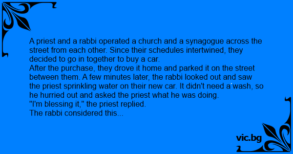 After the purchase, they drove it home and parked it on the street between them. A few minutes later, the rabbi looked out and saw the priest sprinkling water on their new car. It didn't need a wash, so he hurried out and asked the priest what he was doing.