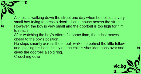 A priest is walking down the street one day when he notices a very small boy trying to press a doorbell on a house across the street.
