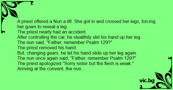 Een priester rijdt in zijn auto langs een nonnetje dat op de stoep loopt. Hij geeft haar een lift. Terwijl zij in stapt valt haar habijt open en laat zij een prachtig lang been zien. De priester...