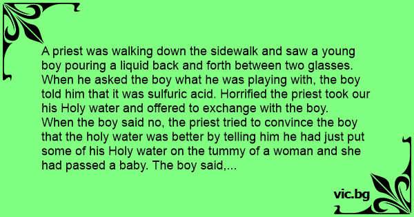 A priest was walking down the sidewalk and saw a young boy pouring a liquid back and forth between two glasses. When he asked the boy what he was playing with, the boy told him that it was sulfuric acid. Horrified the priest took our his Holy water and offered to exchange with the boy.