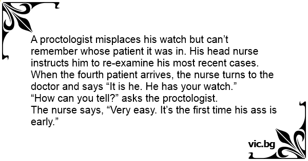 A proctologist misplaces his watch but can’t remember whose patient it was in. His head nurse instructs him to re-examine his most recent cases.