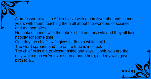 The chief pulls the professor aside and says, "Look, you are the only white man we've ever seen around here, and my wife gave birth to a white child.