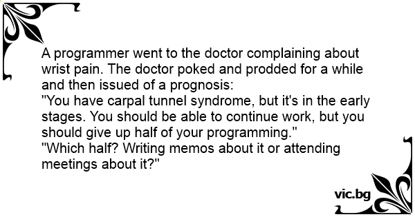 A programmer went to the doctor complaining about wrist pain. The doctor poked and prodded for a while and then issued of a prognosis: "You have carpal tunnel syndrome, but it's in the early stages. You should be able to continue work, but you should give up half of your programming." "Which half? Writing memos about it or attending meetings about it?"