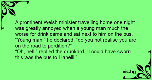 “Oh, hеll,” replied the drunkard. “I could have sworn this was the bus to Llanelli.”