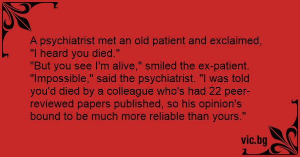 "Impossible," said the psychiatrist. "I was told you'd died by a colleague who's had 22 peer-reviewed papers published, so his opinion's bound to be much more reliable than yours."
