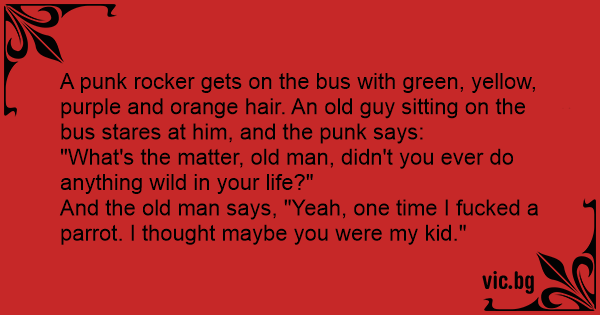One day, an old guy gets on a bus. Several minutes later a punk kid with red, green, and orange hair gets on. The kid notices that the old man keeps staring at him. "What you staring at, old man? Ain't you ever done anything wild in your time?" "Yeah. I screwed a parrot once. I was wondering if...