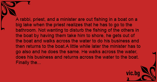 A rabbi, priest, and a minister are out fishing in a boat on a big lake when the priest realizes that he has to go to the bathroom. Not wanting to disturb the fishing of the others in the boat by having them take him to shore, he gets out of the boat and walks across the water to do his business and then returns to the boat.A little while later the minister has to go also and he does the same. He walks across the water, does his business and returns across the water to the boat.