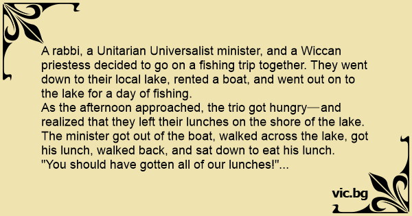 A rabbi, a Unitarian Universalist minister, and a Wiccan priestess decided to go on a fishing trip together. They went down to their local lake, rented a boat, and went out on to the lake for a day of fishing.