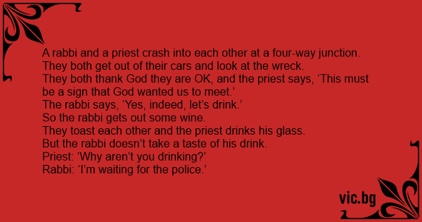 En rabbiner og en præst kommer ud for en bilulykke. Deres biler drøner Sammen og bliver fuldstændigt smadrede. Men besynderlig nok er ingen af de to mænd kommet noget til. Efter at de hver især har...