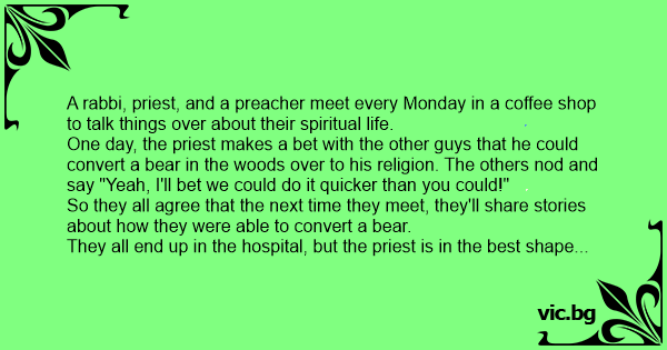 One day, the priest makes a bet with the other guys that he could convert a bear in the woods over to his religion. The others nod and say "Yeah, I'll bet we could do it quicker than you could!"