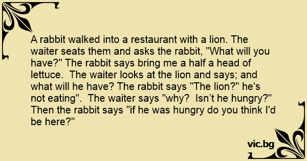 A rabbit walked into a restaurant with a lion. The waiter seats them and asks the rabbit, "What will you have?" The rabbit says bring me a half a head of lettuce. The waiter looks at the lion and says; and what will he have? The rabbit says "The lion?" he's not eating". The waiter says "why? Isn’t he hungry?" Then the rabbit says "if he was hungry do you think I'd be here?"