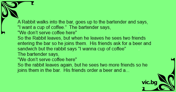 So the Rabbit leaves, but when he leaves he sees two friends entering the bar so he joins them. His friends ask for a вееr and sandwich but the rabbit says "I wanna cup of coffee"