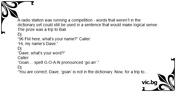 A radio station was running a competition - words that weren’t in the dictionary yet could still be used in a sentence that would make logical sense. The prize was a trip to Bali.
