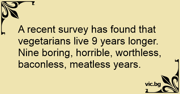 A recent survey has found that vegetarians live 9 years longer. Nine boring, horrible, worthless, baconless, meatless years.