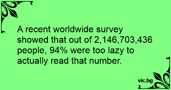 A recent worldwide survey showed that out of 2,146,703,436 people, 94% were too lazy to actually read that number.