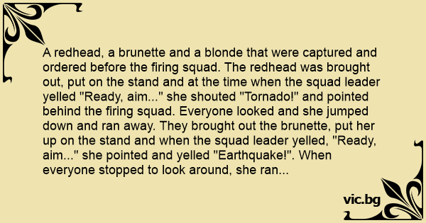 A redhead, a brunette and a blonde that were captured and ordered before the firing squad. The redhead was brought out, put on the stand and at the time when the squad leader yelled "Ready, aim..." she shouted "Tornado!" and pointed behind the firing squad. Everyone looked and she jumped down and ran away. They brought out the brunette, put her up on the stand and when the squad leader yelled, "Ready, aim..." she pointed and yelled "Earthquake!". When everyone stopped to look around, she ran away. Finally, the firing squad brought the blonde out and when the squad leader yelled "Ready, aim..." she pointed and yelled "Fire!"