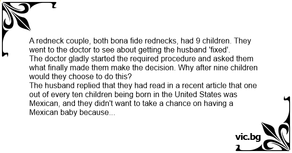 A redneck couple, both bona fide rednecks, had 9 children. They went to the doctor to see about getting the husband 'fixed'.