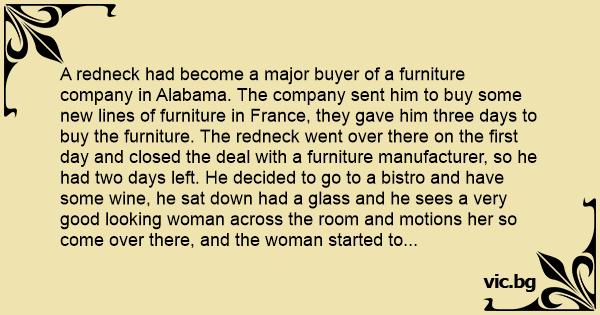 A redneck had become a major buyer of a furniture company in Alabama. The company sent him to buy some new lines of furniture in France, they gave him three days to buy the furniture. The redneck went over there on the first day and closed the deal with a furniture manufacturer, so he had two days left. He decided to go to a bistro and have some wine, he sat down had a glass and he sees a very good looking woman across the room and motions her so come over there, and the woman started to speak to him in french so put his hand up to hush her up, and he drew a picture of a wine glass and she nods her head and he orders her a glass of wine and they continue to talk this way, he then draws some food and she nods her head so they go to restaurant and he orders two plates of pasta and they continue to talk through drawing. When the redneck hears some music playing he draws a picture of two stick figures dancing, and she nods her head and they start dancing. So when they stop dancing the woman draws a picture of a four post bed, and till this day that redneck does not know how she knew he was in the furniture business.