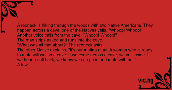 A redneck is hiking through the woods with two Native Americans. They happen across a cave. one of the Natives yells, "Whoop! Whoop!"