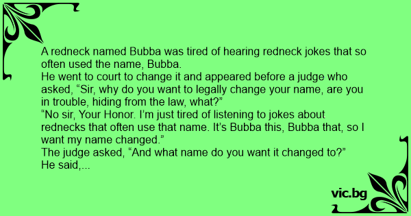 “No sir, Your Honor. I’m just tired of listening to jokes about rednecks that often use that name. It’s Bubba this, Bubba that, so I want my name changed.”